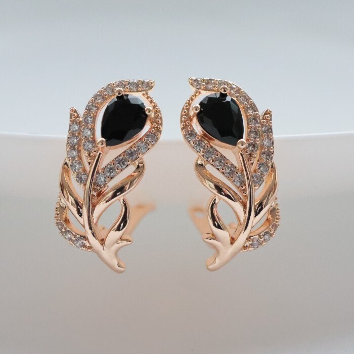 Серьги в форме пера ювелирная бижутерия коллекция "Дубай" покрытие: позолота, вставка: фианиты, цвет: черный, арт.217.247 2 фото