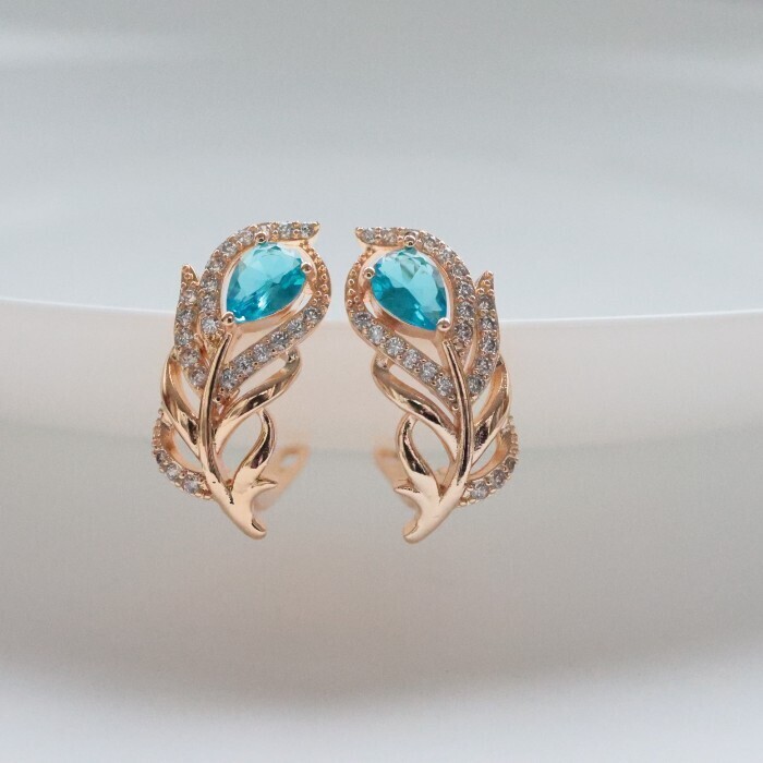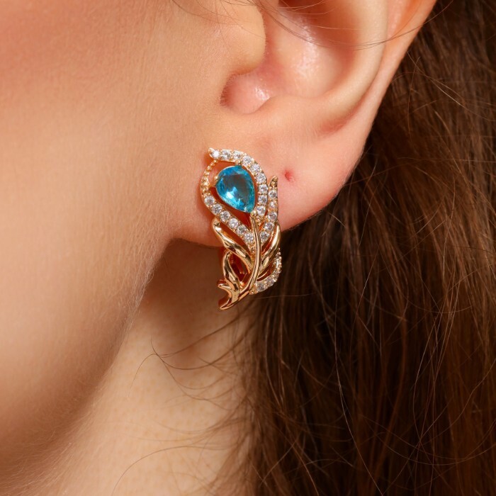 Серьги в форме пера ювелирная бижутерия коллекция "Дубай" покрытие: позолота, вставка: фианиты, цвет: голубой, арт.217.246 2 фото