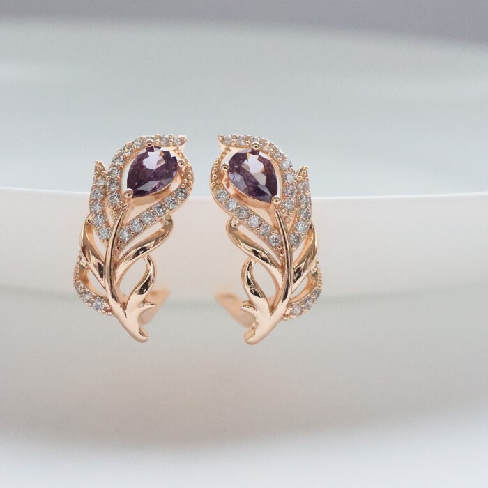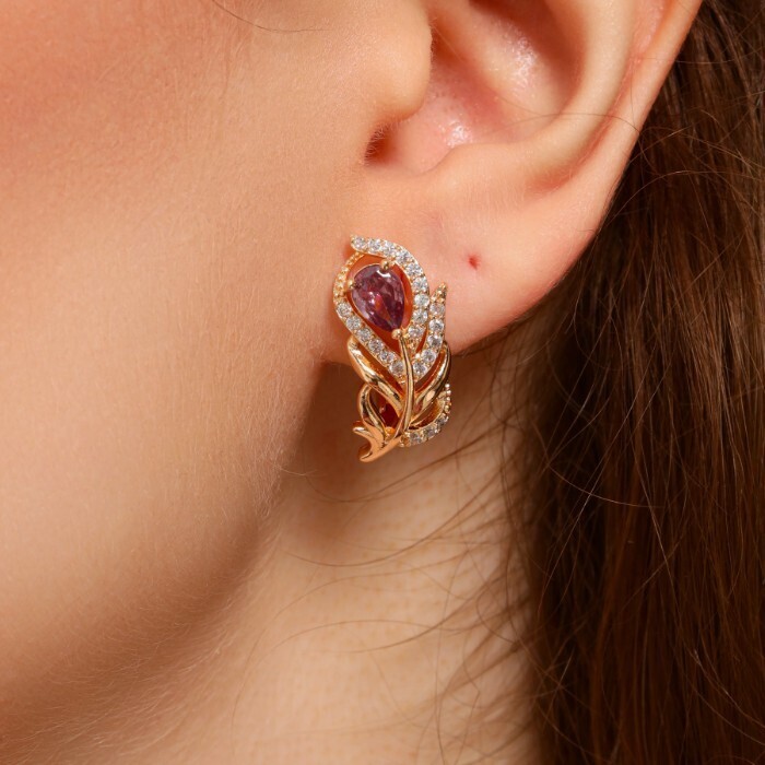 Серьги в форме пера ювелирная бижутерия коллекция "Дубай" покрытие: позолота, вставка: фианиты, цвет: фиолетовый, арт.217.245 2 фото