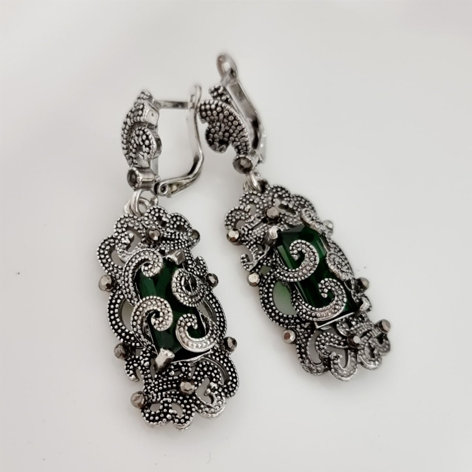 Серьги подвески ювелирная бижутерия, покрытие посеребрение, вставка: фианиты, цвет графит и зеленый, Уценка,  арт.213.741