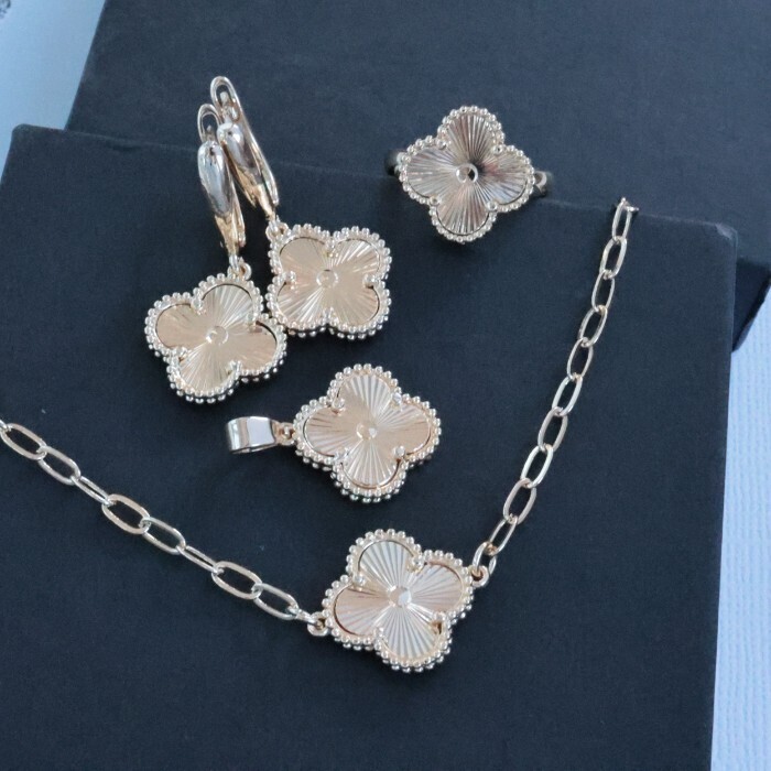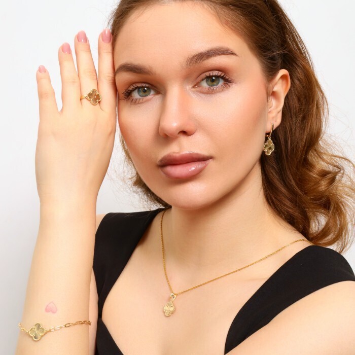 Комплект ювелирной бижутерии Итальянское золото (покрытие желтое 14к) в форме клевера, серьги, кулон, браслет и кольцо 18 р, арт.213.730-18 2 фото