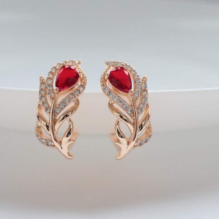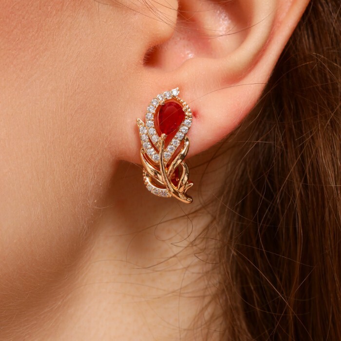 Серьги в форме пера ювелирная бижутерия коллекция "Дубай" покрытие: позолота, вставка: фианиты, цвет: красный, арт.217.244 2 фото