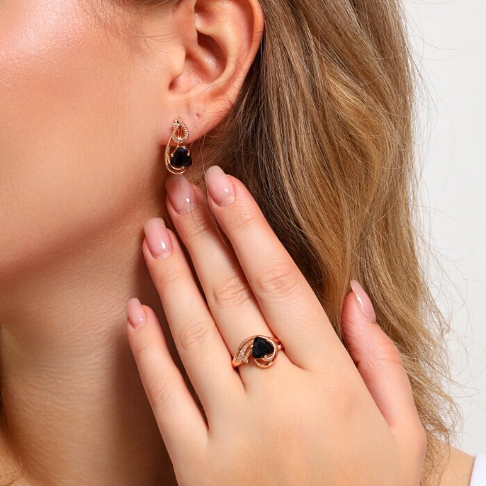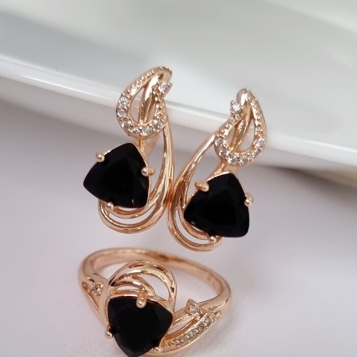 Комплект ювелирная бижутерия коллекция  "Дубай" серьги и кольцо 18 р, покрытие: позолота, вставка: фианиты, цвет: черный, арт.217.311-18 2 фото