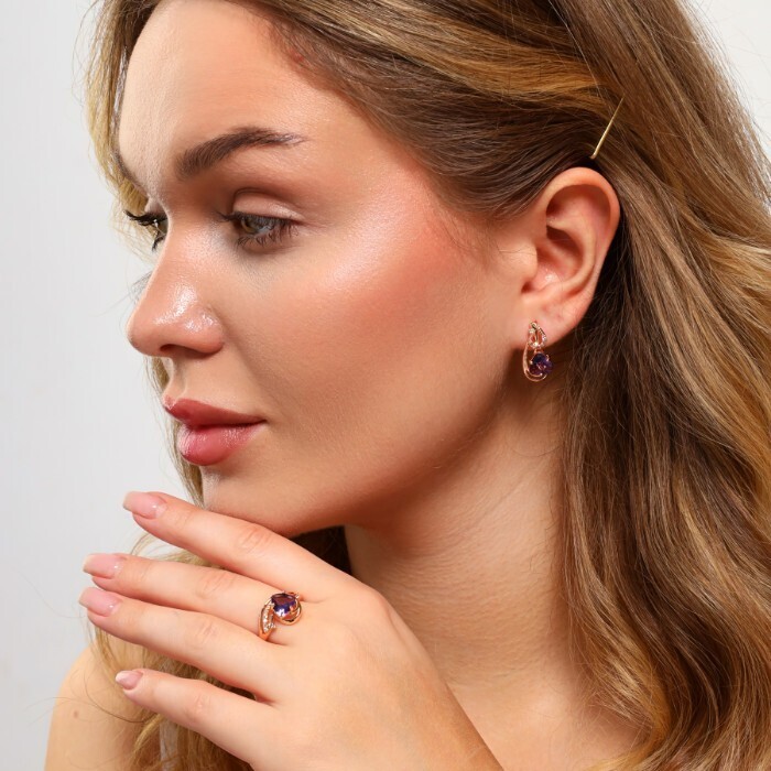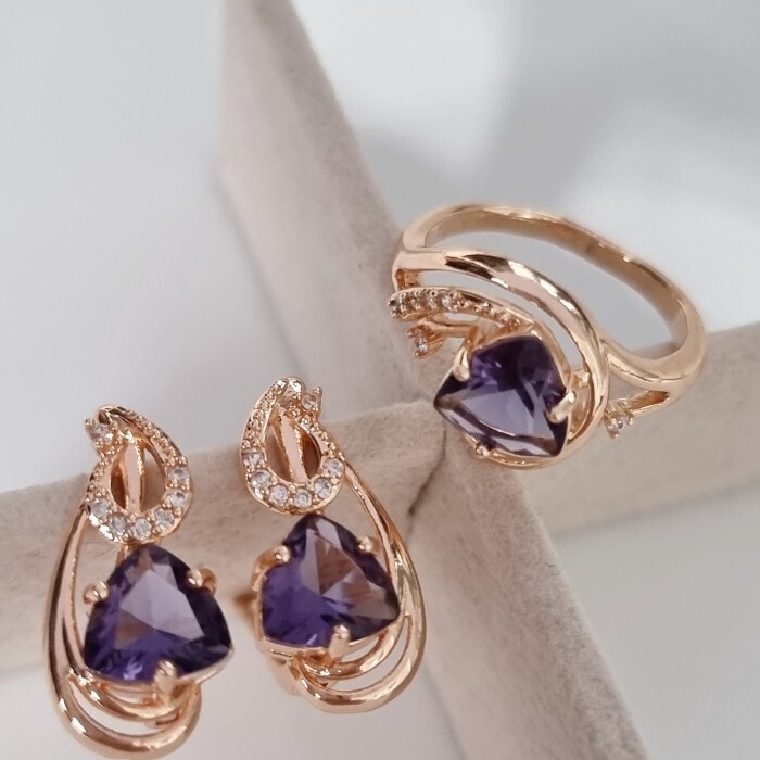 Комплект ювелирная бижутерия коллекция  "Дубай" серьги и кольцо 19 р, покрытие: позолота, вставка: фианиты, цвет: фиолетовый, арт.217.306-18 (1) 2 фото