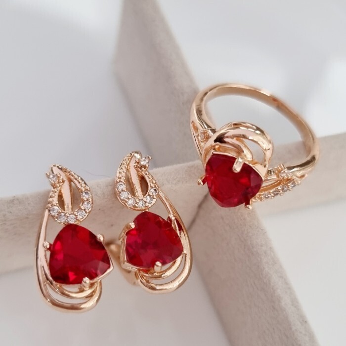 Комплект ювелирной бижутерии Дубайское золото, покрытие: позолота, серьги и кольцо 18 р, вставка: фианит, цвет: красный, арт.314.767-18 2 фото