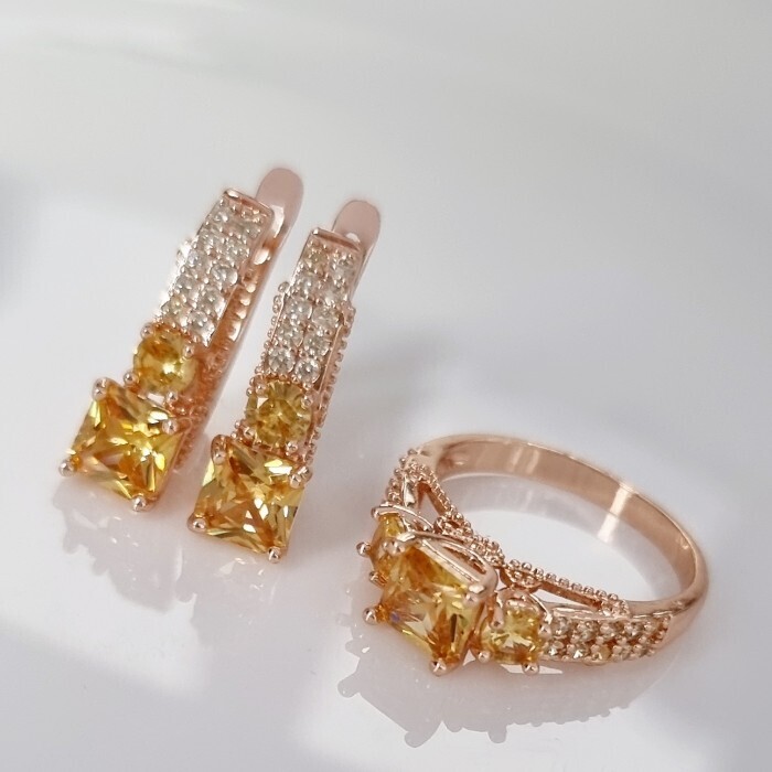Комплект ювелирной бижутерии Дубайское золото, покрытие: позолота, серьги и кольцо 17 р, вставка: фианит, цвет: желтый, арт.314.768-17 2 фото