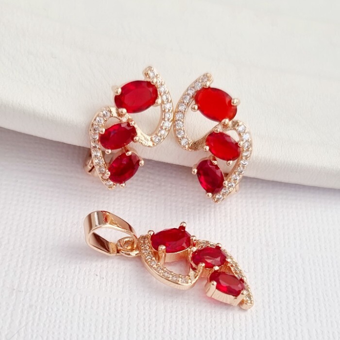 Комплект ювелирной бижутерии коллекция "Дубай" серьги и кулон, покрытие позолота, вставка: фианиты и цирконы, цвет: красный и прозрачный, арт.414.031
