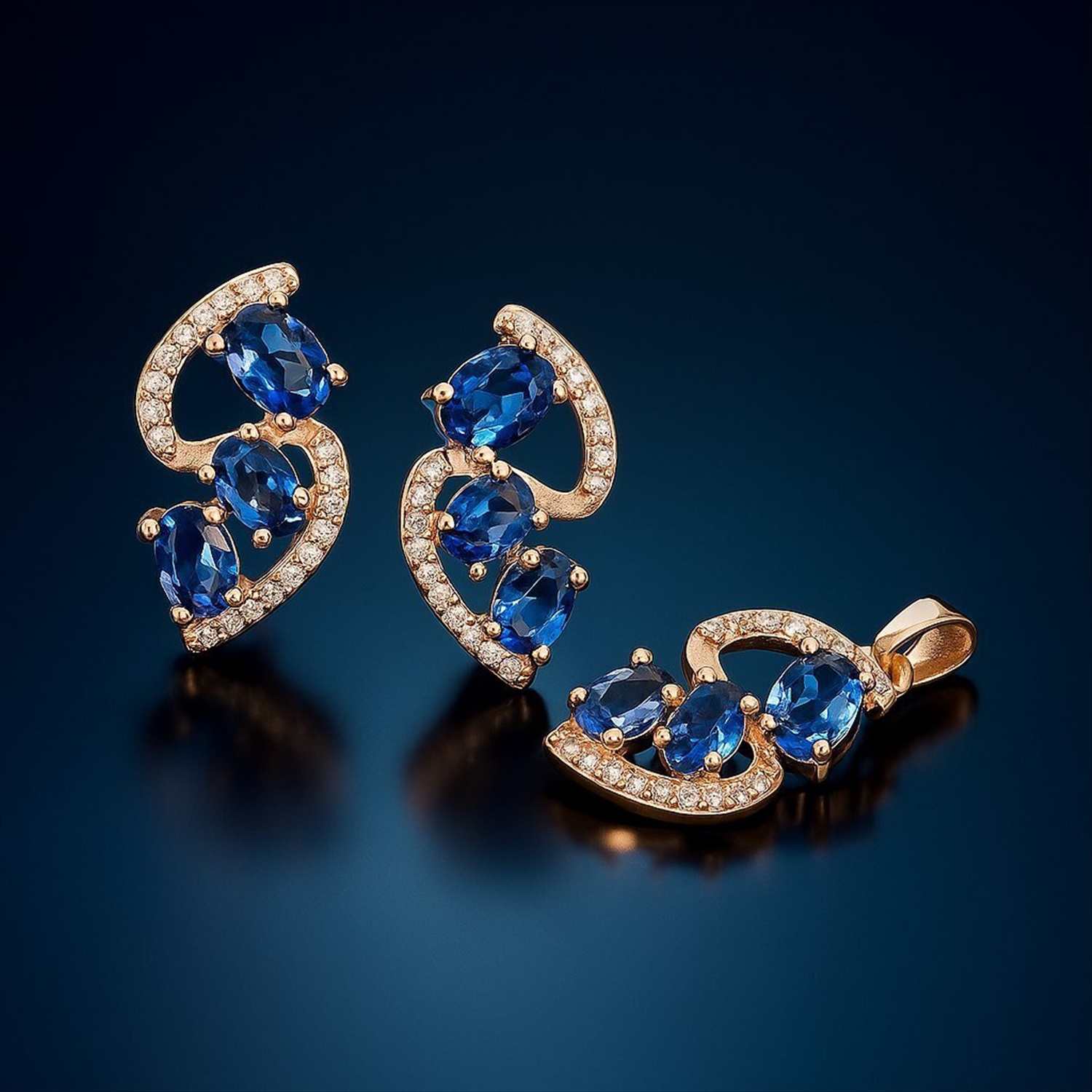 Комплект ювелирной бижутерии коллекция "Дубай" серьги и кулон, покрытие позолота, вставка: фианиты и цирконы, цвет: синий и прозрачный, арт.414.029