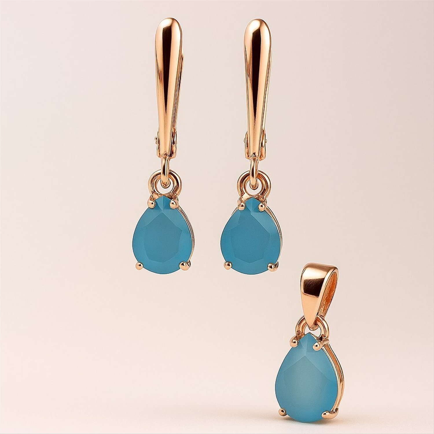 Комплект ювелирной бижутерии коллекция "Дубай" серьги и кулон, покрытие позолота, вставка: фианиты, цвет: голубой матовый, арт.314.972
