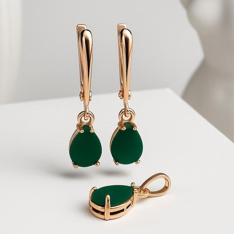 Комплект ювелирной бижутерии коллекция "Дубай" серьги и кулон, покрытие позолота, вставка: фианиты, цвет: изумрудный матовый, арт.314.977 3 фото