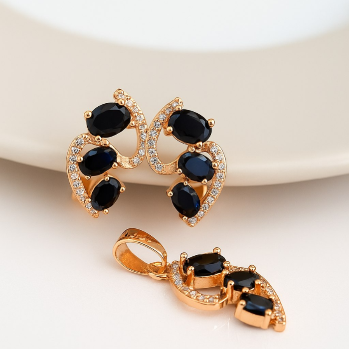 Комплект ювелирной бижутерии коллекция "Дубай" серьги и кулон, покрытие позолота, вставка: фианиты и цирконы, цвет: черный и прозрачный, арт.414.027