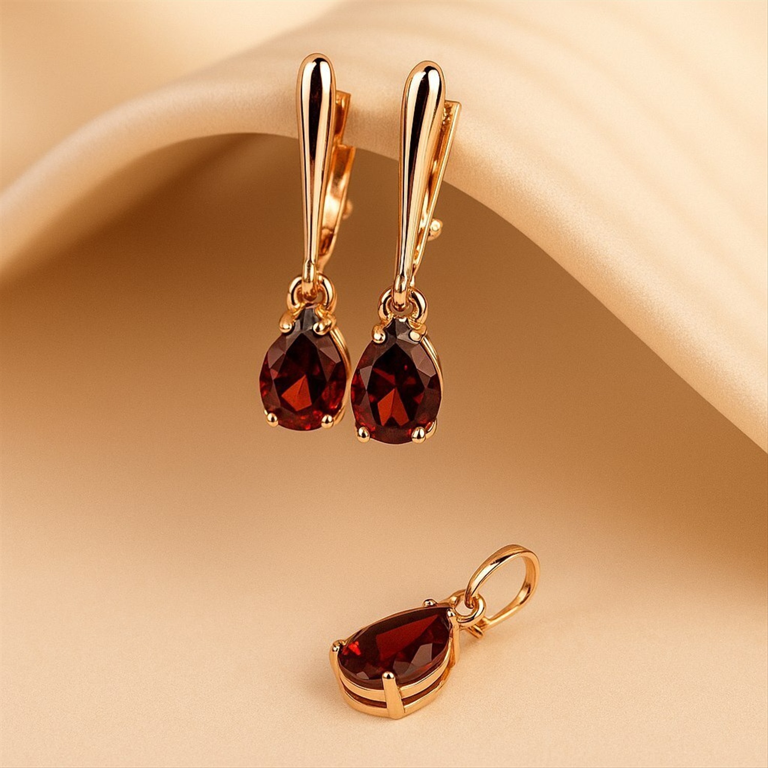 Комплект ювелирной бижутерии коллекция "Дубай" серьги и кулон, покрытие позолота, вставка: фианиты, цвет: красный, арт.314.971