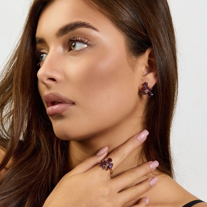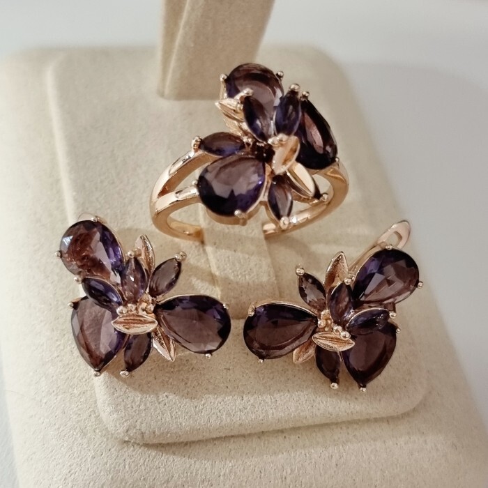Комплект ювелирной бижутерии коллекция "Дубай" серьги и кольцо 18 р, покрытие позолота, вставка: стекло, цвет: фиолетовый, арт.215.566-18 2 фото