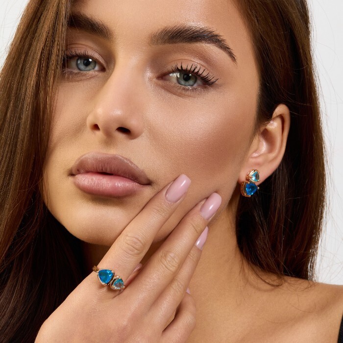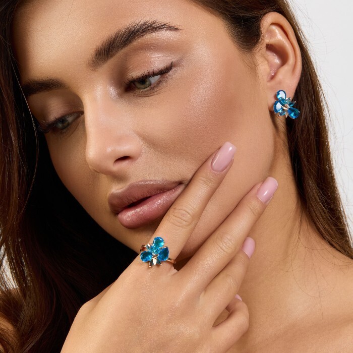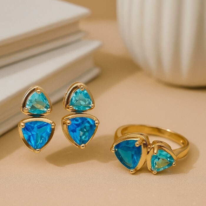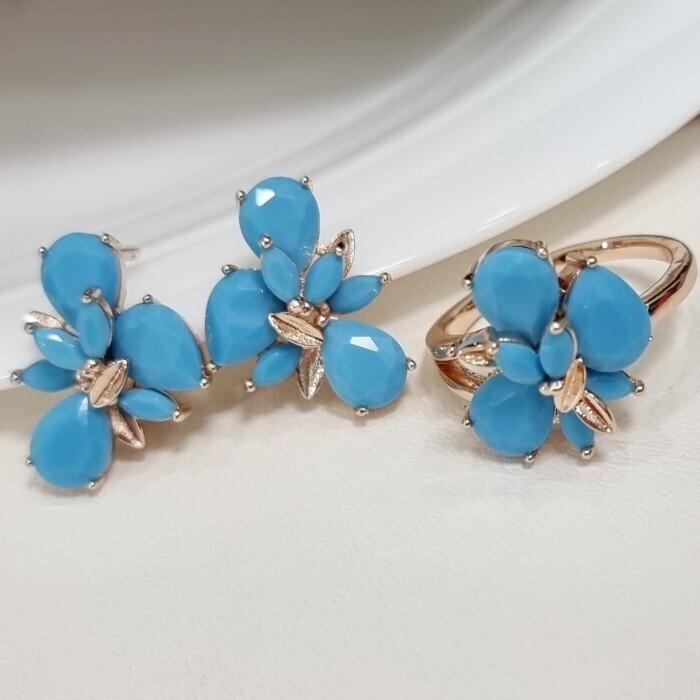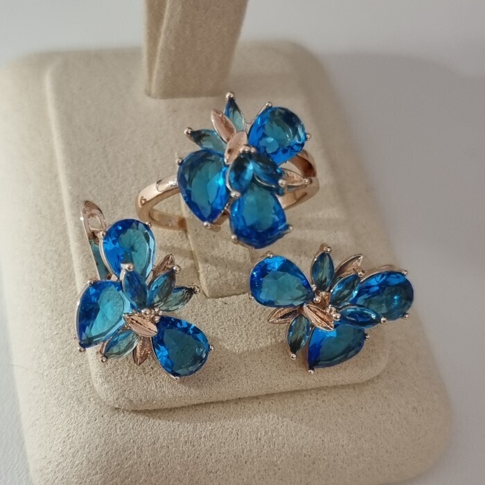 Комплект ювелирной бижутерии коллекция "Дубай" серьги и кольцо 18 р покрытие позолота, вставка: стекло, цвет: голубой, арт.414.193-18 2 фото
