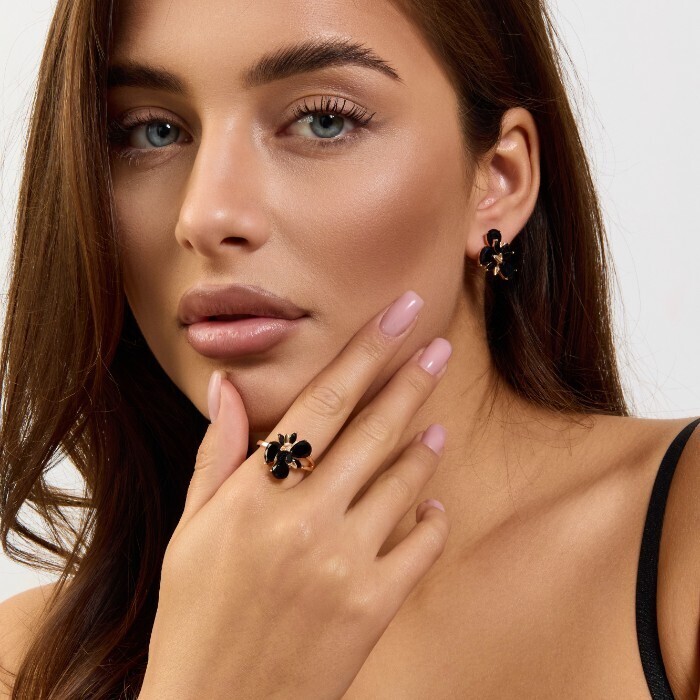 Комплект ювелирной бижутерии коллекция "Дубай" серьги и кольцо 17 р, покрытие позолота, вставка: стекло, цвет: черный, арт.414.191-17 2 фото