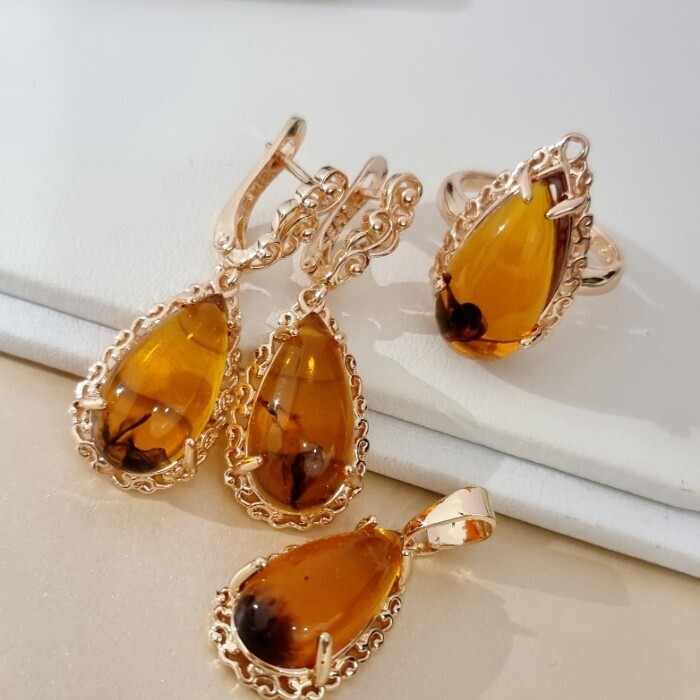Комплект ювелирной бижутерии коллекция "Дубай" серьги, кулон и кольцо 20 р покрытие позолота, вставка: искусственный янтарь, арт.414.232-20 2 фото