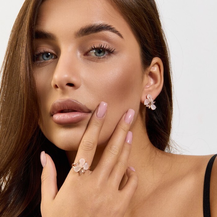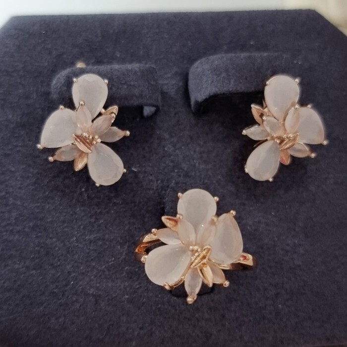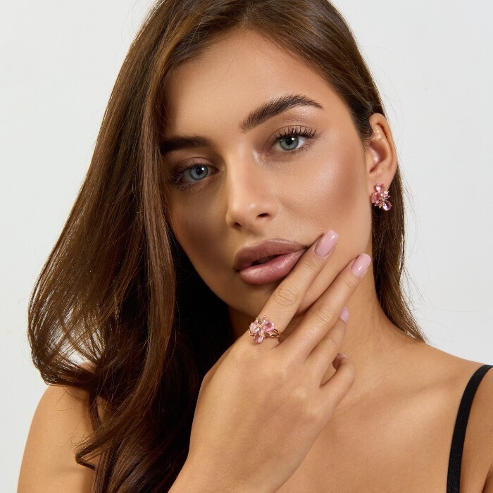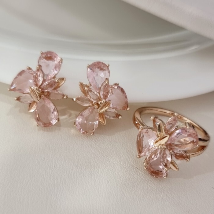 Комплект ювелирной бижутерии коллекция "Дубай" серьги и кольцо 18 р, покрытие позолота, вставка: стекло, цвет: розовый, арт.215.557-18 2 фото