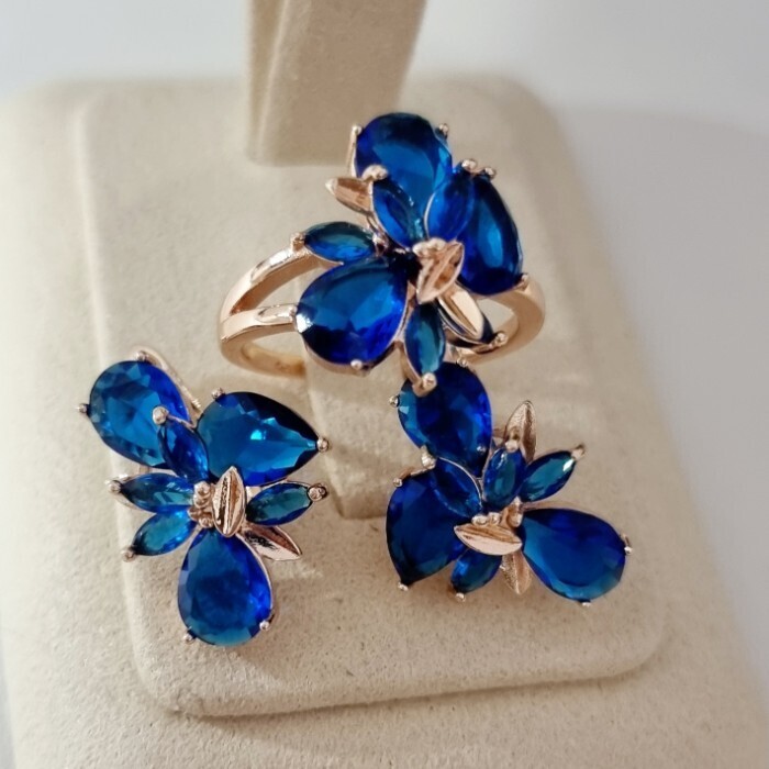 Комплект ювелирной бижутерии коллекция "Дубай" серьги и кольцо 18 р, покрытие позолота, вставка: стекло, цвет: синий, арт.215.567-18 2 фото