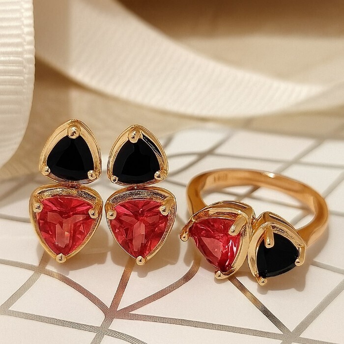 Комплект ювелирной бижутерии коллекция "Дубай" серьги и кольцо 20 р, покрытие позолота, вставка: стекло, цвет: черный и рубиновый, арт.414.202-20 2 фото