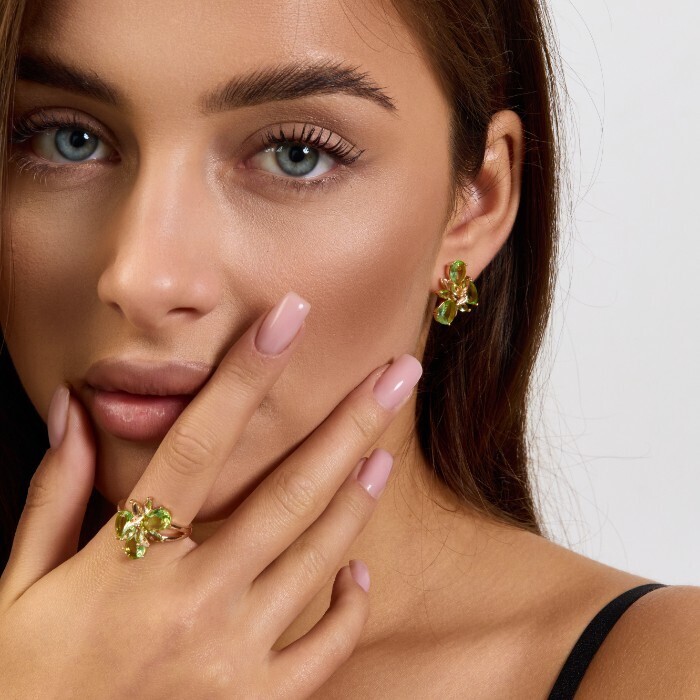 Комплект ювелирной бижутерии коллекция "Дубай" серьги и кольцо 17 р покрытие позолота, вставка: стекло, цвет: бледно-зеленый и желтый, арт.414.189-17 2 фото
