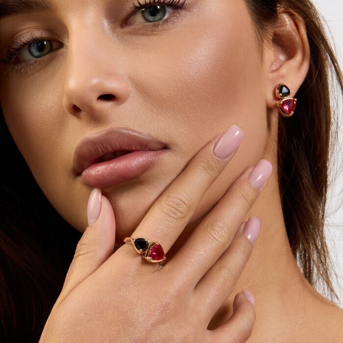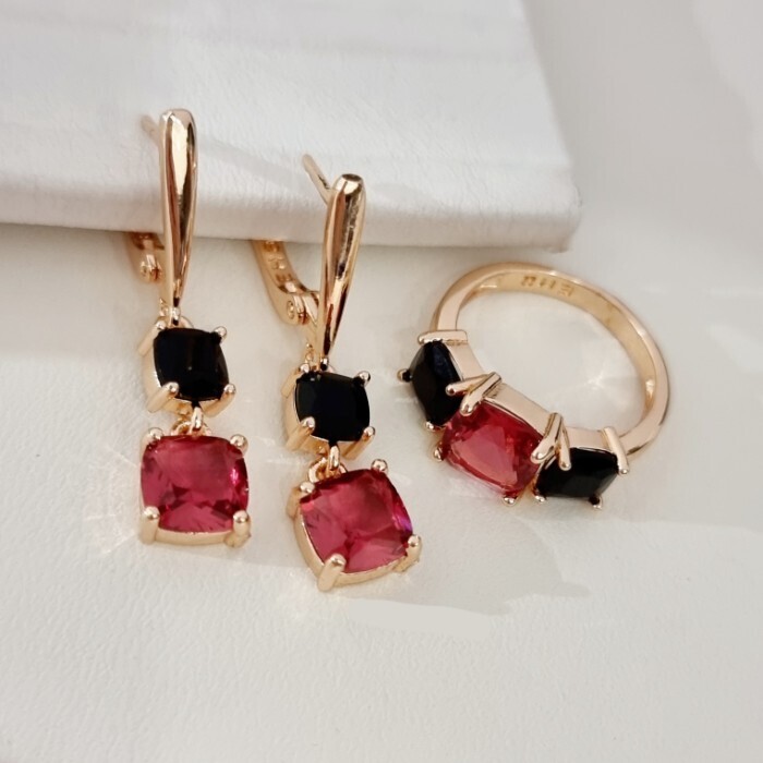 Комплект ювелирной бижутерии коллекция "Дубай" серьги и кольцо 18 р, покрытие позолота, вставка: стекло, цвет: черный и рубиновый, арт.414.188-18 2 фото