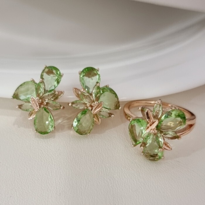 Комплект ювелирной бижутерии коллекция "Дубай" серьги и кольцо 18 р, покрытие позолота, вставка: стекло, цвет: светло-зеленый, арт.215.564-18 2 фото