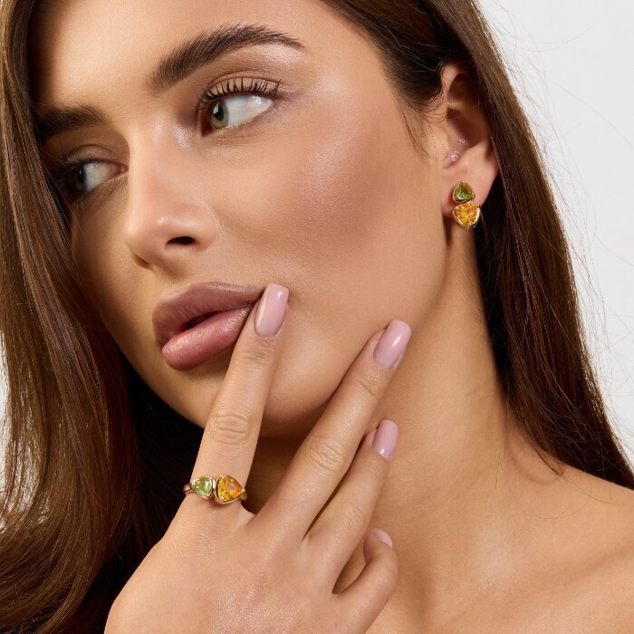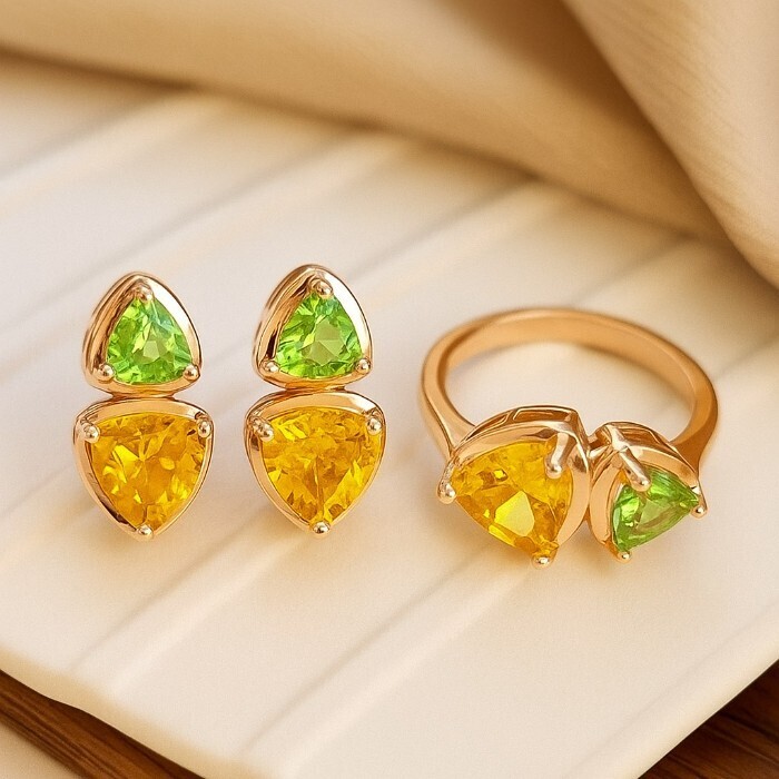Комплект ювелирной бижутерии коллекция "Дубай" серьги и кольцо 18 р покрытие позолота, вставка: стекло, цвет: бледно-зеленый и желтый, арт.414.189-18 2 фото