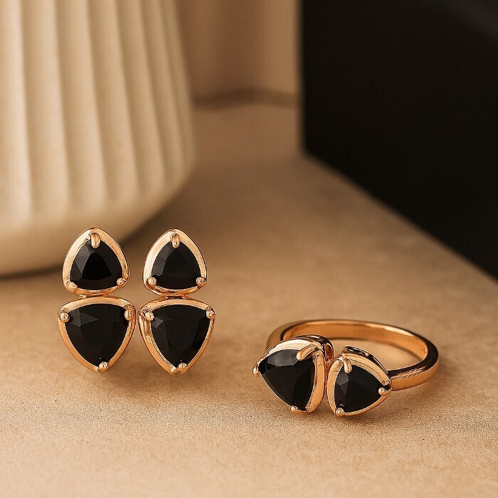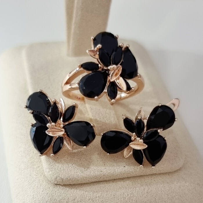 Комплект ювелирной бижутерии коллекция "Дубай" серьги и кольцо 18 р, покрытие позолота, вставка: стекло, цвет: черный, арт.215.565-18 2 фото
