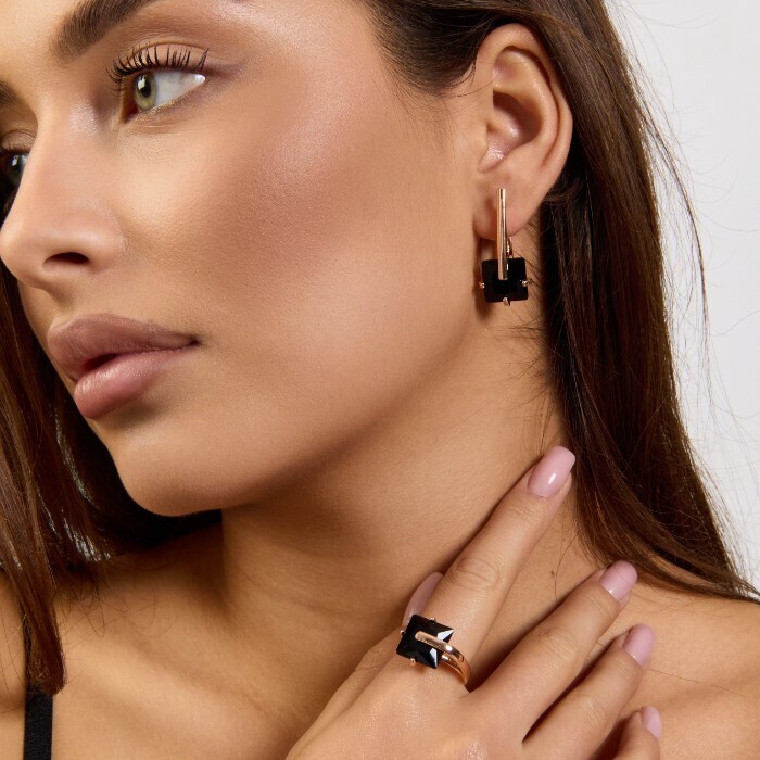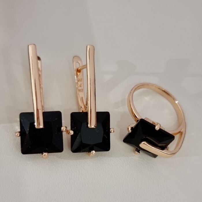 Комплект ювелирной бижутерии коллекция "Дубай" серьги и кольцо 17 р, покрытие позолота, вставка: стекло, цвет: черный, арт.414.166-17 2 фото