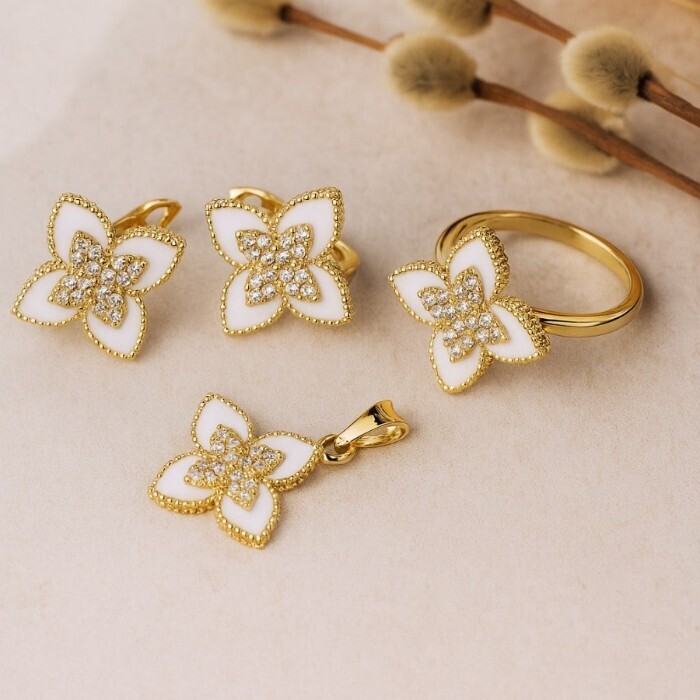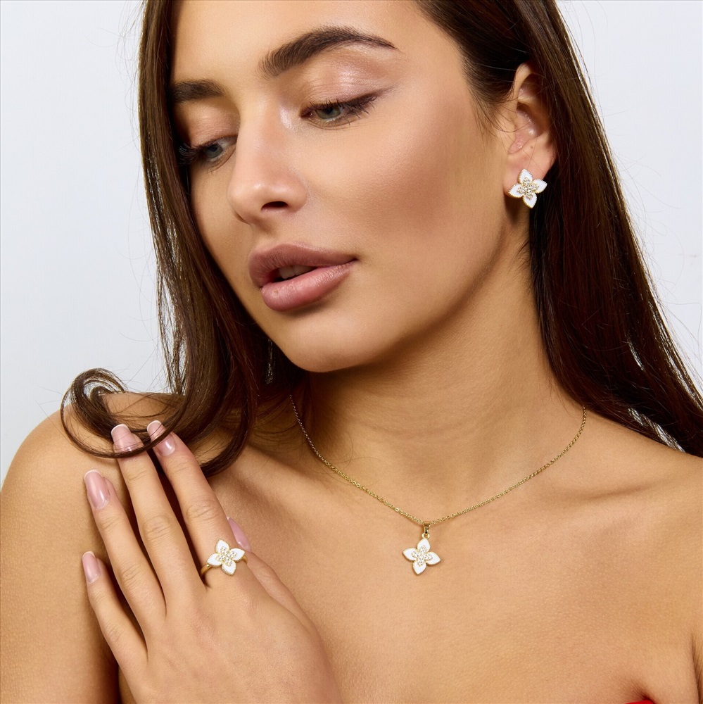 Комплект ювелирной бижутерии Итальянское золото (покрытие желтое 14к) серьги, кулон и кольцо 18 р, вставка: эмаль и  цирконы, цвет: белый и прозрачный, арт.217.380-18 2 фото