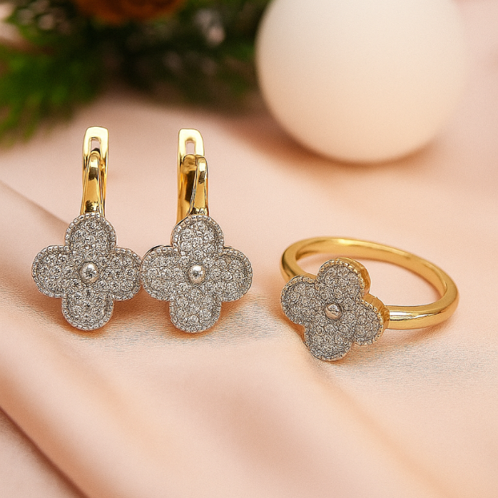 Комплект ювелирной бижутерии Итальянское золото (покрытие желтое 14к) серьги и кольцо 19 р, вставка: фианиты, цвет: прозрачный, арт.217.407-19 2 фото
