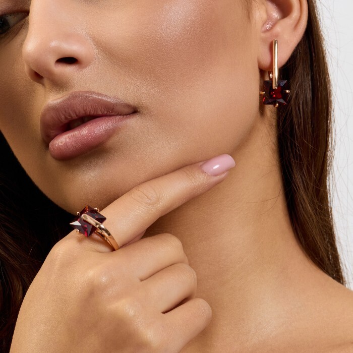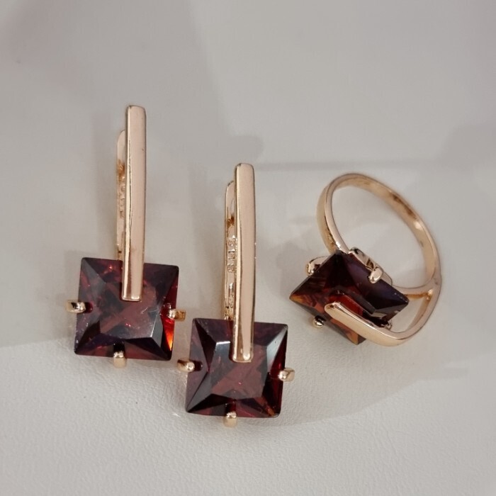 Комплект ювелирной бижутерии коллекция "Дубай" серьги и кольцо 18 р, покрытие позолота, вставка: стекло, цвет: винно-краснный, арт.414.167-18 2 фото