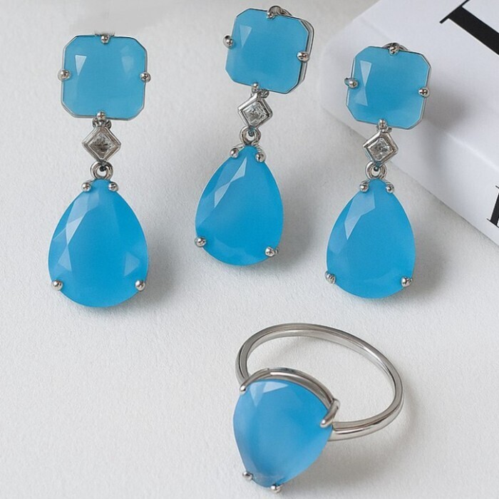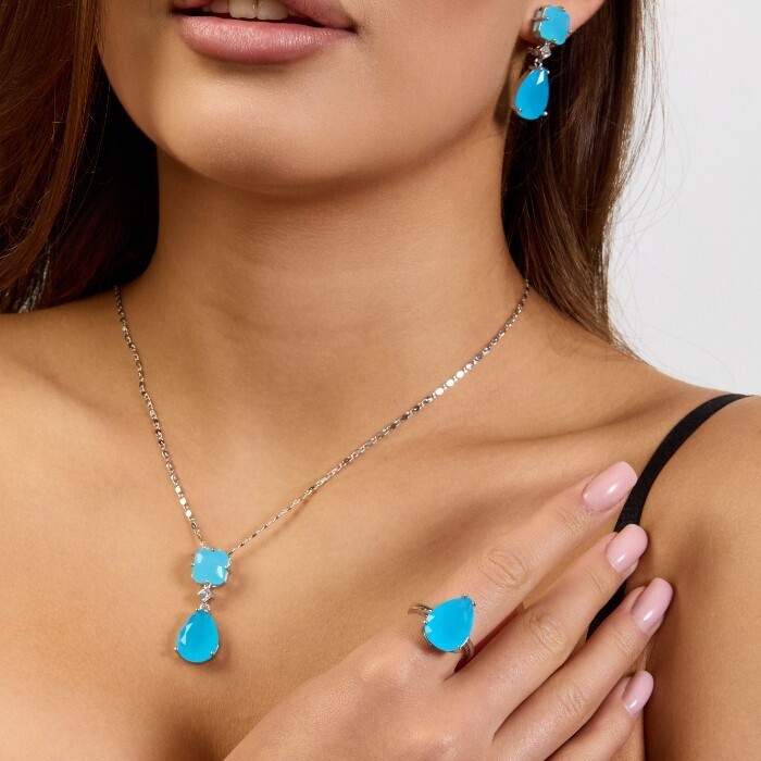 Комплект ювелирной бижутерии коллекция "Дубай" серьги, кулон и кольцо 20 р, покрытие посеребрение, вставка: стекло, цвет: голубой матовый, арт.414.183-20 2 фото