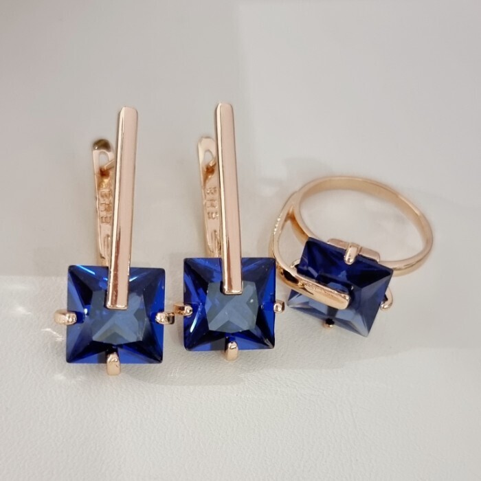 Комплект ювелирной бижутерии коллекция "Дубай" серьги и кольцо 20 р, покрытие позолота, вставка: стекло, цвет: синий, арт.414.173-20 2 фото