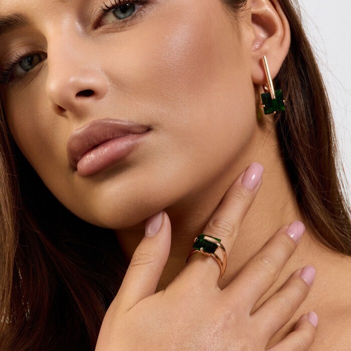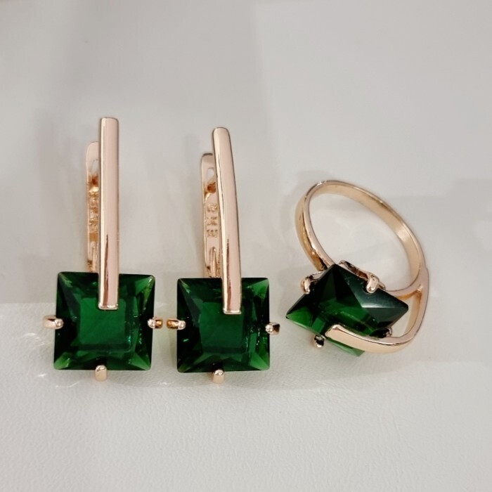 Комплект ювелирной бижутерии коллекция "Дубай" серьги и кольцо 17 р, покрытие позолота, вставка: стекло, цвет: изумрудный, арт.414.171-17 2 фото