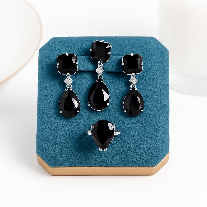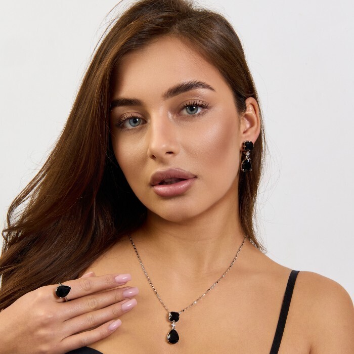 Комплект ювелирной бижутерии коллекция "Дубай" серьги, кулон и кольцо 19 р, покрытие посеребрение, вставка: стекло, цвет: черный, арт.414.182-19 2 фото