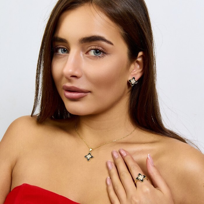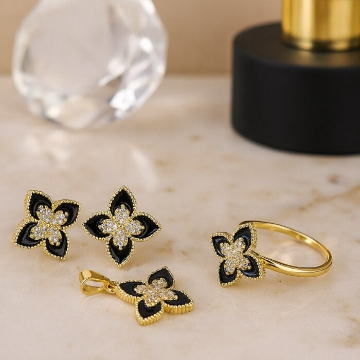 Комплект ювелирной бижутерии Итальянское золото (покрытие желтое 14к) серьги, кулон и кольцо 18 р, вставка: эмаль и  цирконы, цвет: черный и прозрачный, арт.217.381-18 2 фото