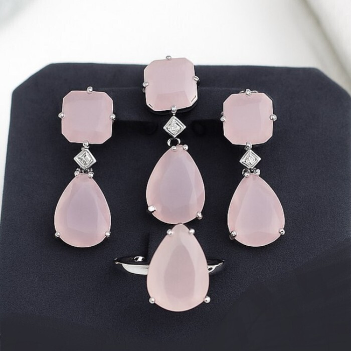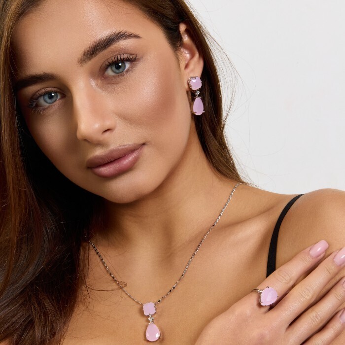 Комплект ювелирной бижутерии коллекция "Дубай" серьги, кулон и кольцо 17 р, покрытие посеребрение, вставка: стекло, цвет: розовый матовый, арт.414.181-17 2 фото