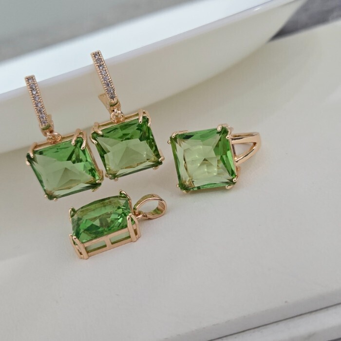 Комплект ювелирной бижутерии Дубайское золото: серьги и кулон с крупным камнем, покрытие позолота, вставка: фианит, цвет: светлый зеленый, арт.414.037