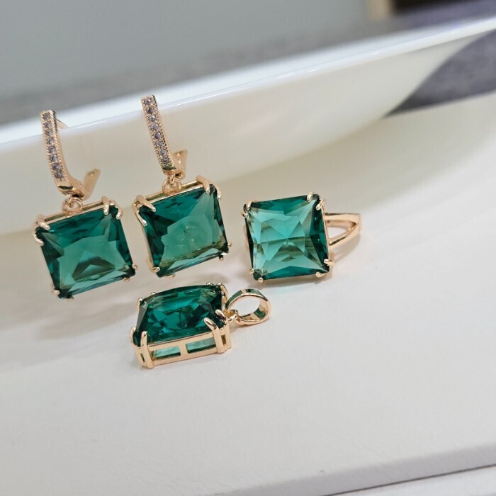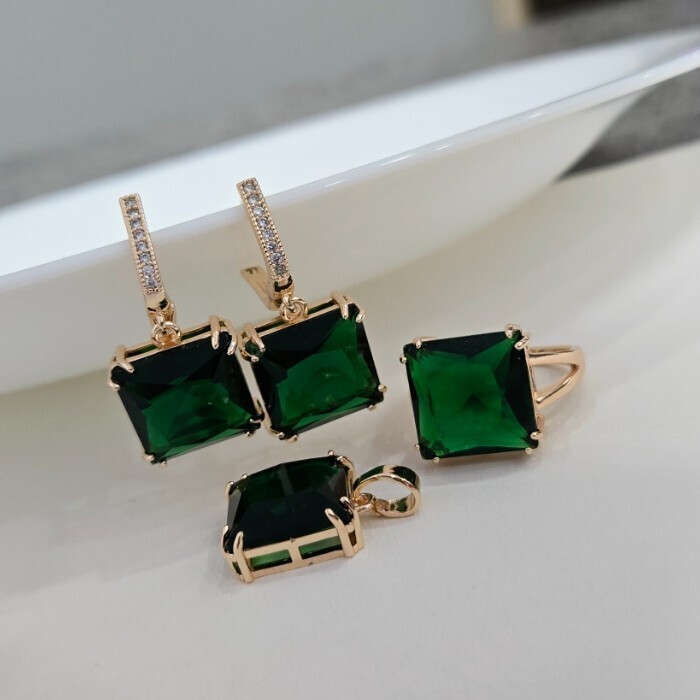 Комплект ювелирной бижутерии Дубайское золото: серьги, кулон и кольцо 20 р с крупным камнем, покрытие позолота, вставка: фианит, цвет: изумрудный зеленый, арт.314.961-20 2 фото