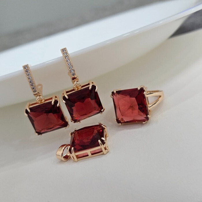 Комплект ювелирной бижутерии Дубайское золото: серьги, кулон и кольцо 18 р с крупным камнем, покрытие позолота, вставка: фианит, цвет: красный, арт.314.963-18 2 фото