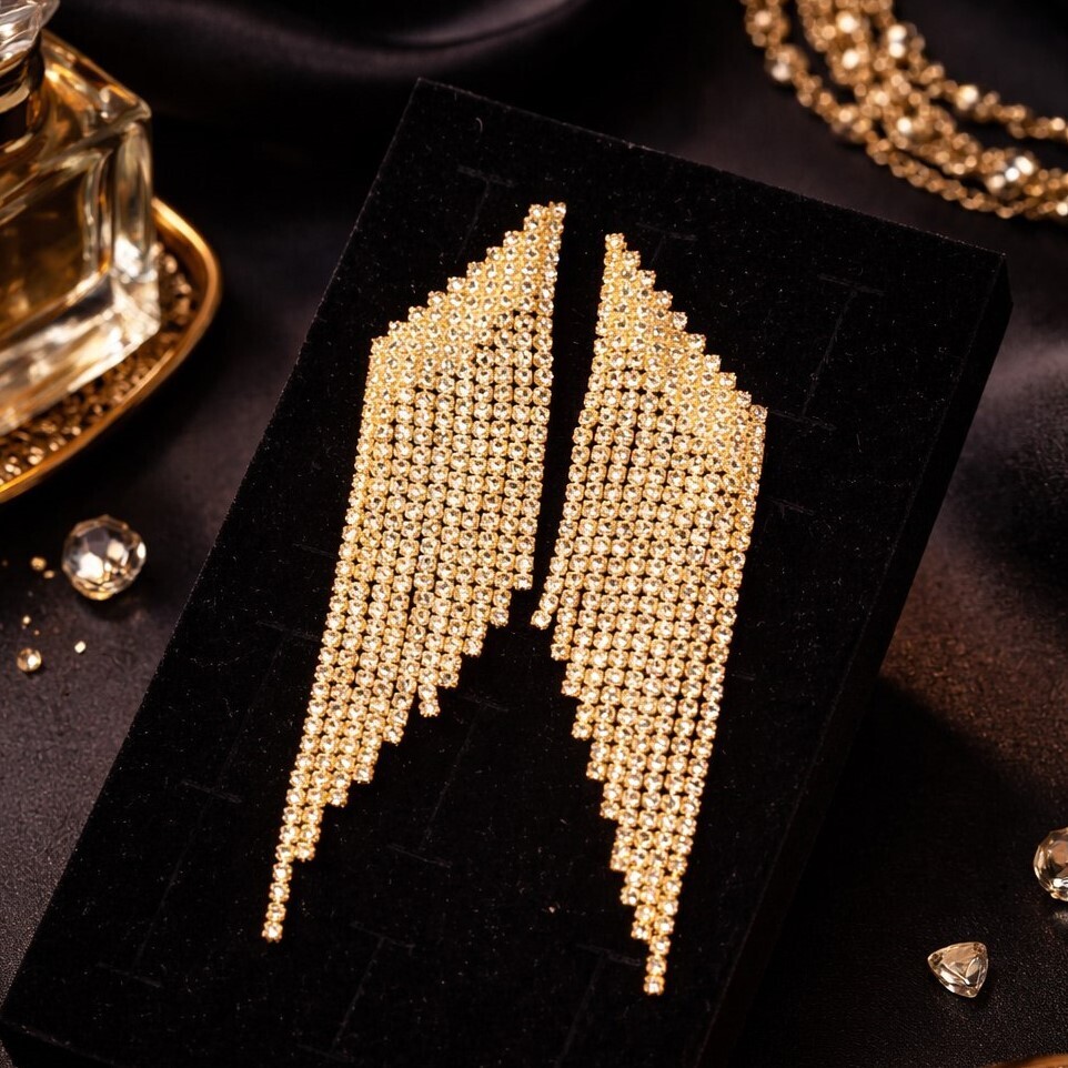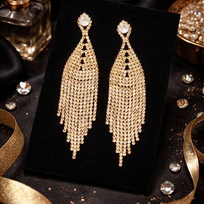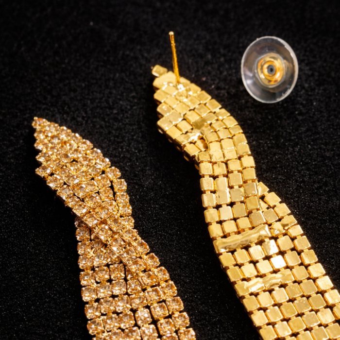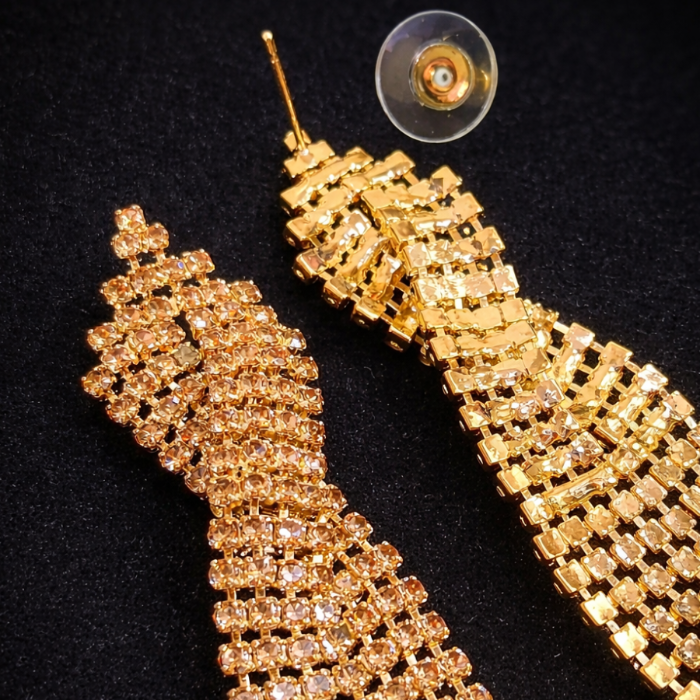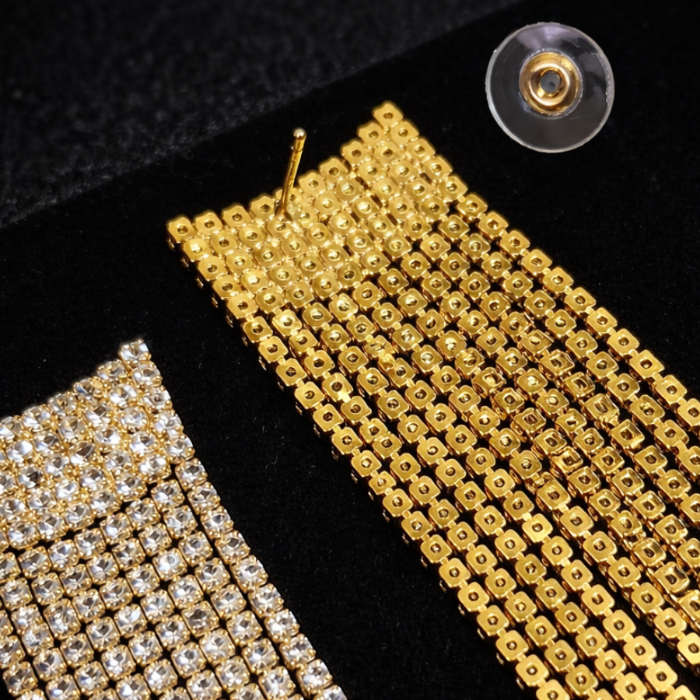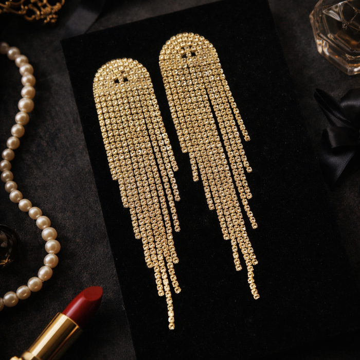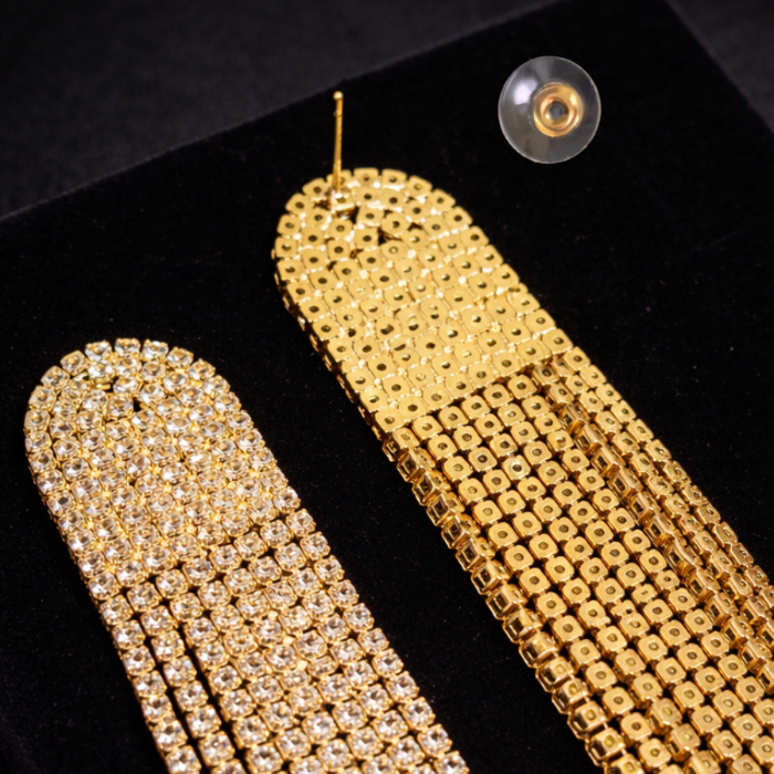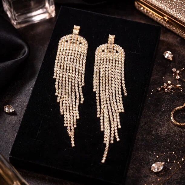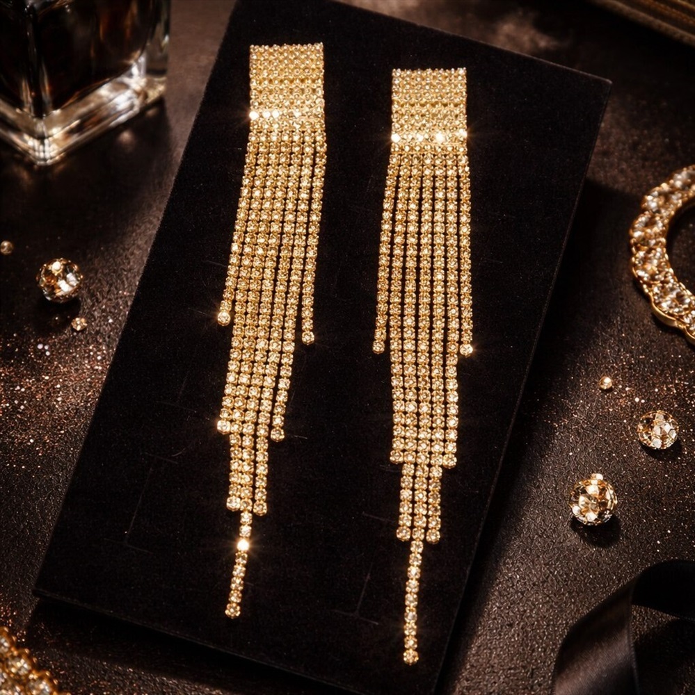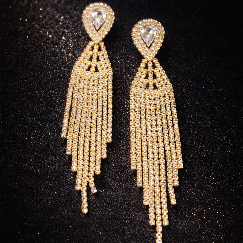 Серьги длинные женские вечерние со стразами, цвет: золотистый и прозрачный, арт.012.041 2 фото