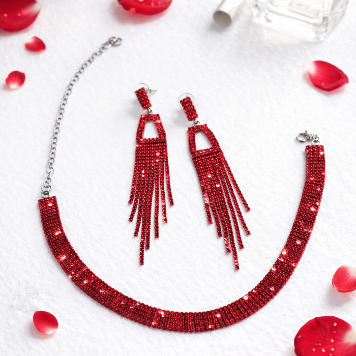 Комплект вечерней бижутерии со стразами чокер и серьги, цвет: красный, арт.012.102 2 фото