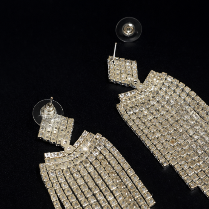 Серьги бижутерия висячие вечерние с камнями, цвет: серебристый и прозрачный, арт.012.054 3 фото