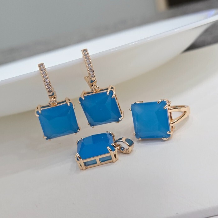 Комплект ювелирной бижутерии Дубайское золото: серьги и кулон с крупным камнем, покрытие позолота, вставка: фианит, цвет: голубой, арт.414.038