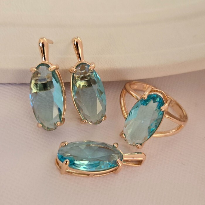 Комплект ювелирной бижутерии коллекция "Дубай"серьги, кулон и кольцо 18 р, покрытие позолота, вставка: фианит, цвет: голубой, арт.216.409-18