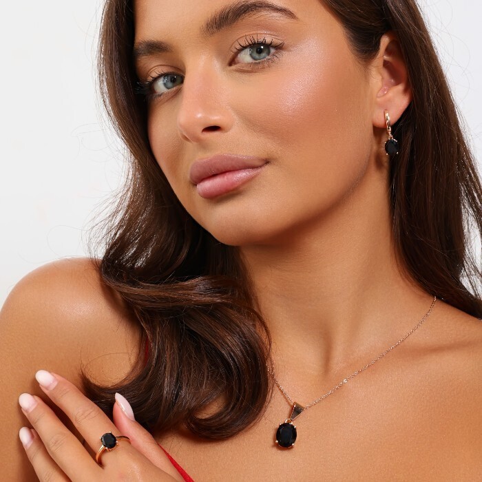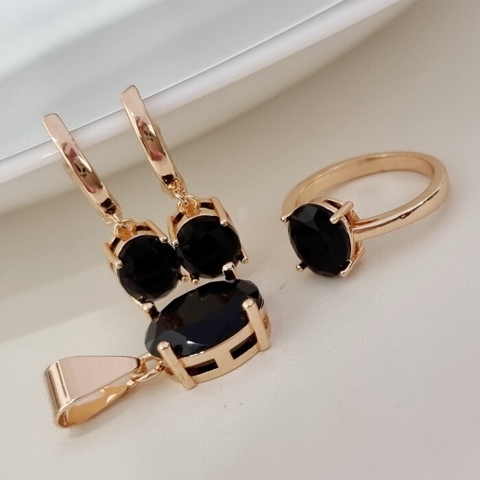 Комплект ювелирной бижутерии коллекция "Дубай" серьги, кулон и кольцо 18 р, покрытие позолота, вставка: фианит, цвет: черный, арт.215.510-18 2 фото