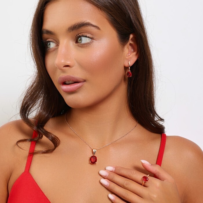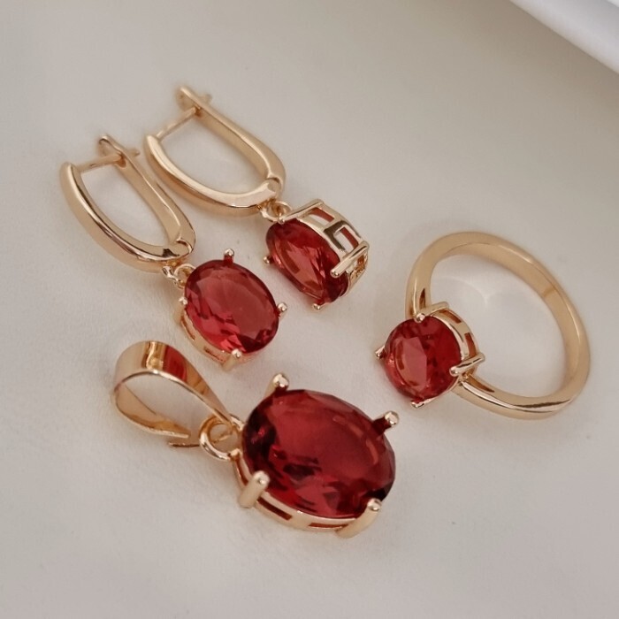 Комплект ювелирной бижутерии коллекция "Дубай" серьги, кулон и кольцо 18 р, покрытие позолота, вставка: фианит, цвет: малиновый, арт.215.514-18 2 фото