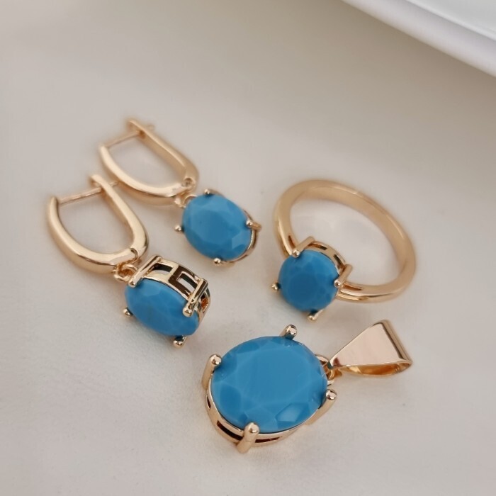 Комплект ювелирной бижутерии коллекция "Дубай" серьги, кулон и кольцо 17 р, покрытие позолота, вставка: фианит, цвет: голубой матовый, арт.215.508-17 2 фото