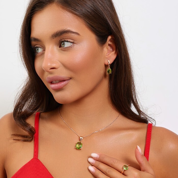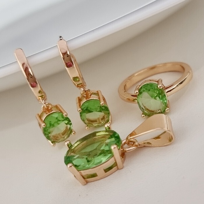 Комплект ювелирной бижутерии коллекция "Дубай" серьги, кулон и кольцо 17 р, покрытие позолота, вставка: фианит, цвет: светло-зеленый, арт.215.511-17 2 фото